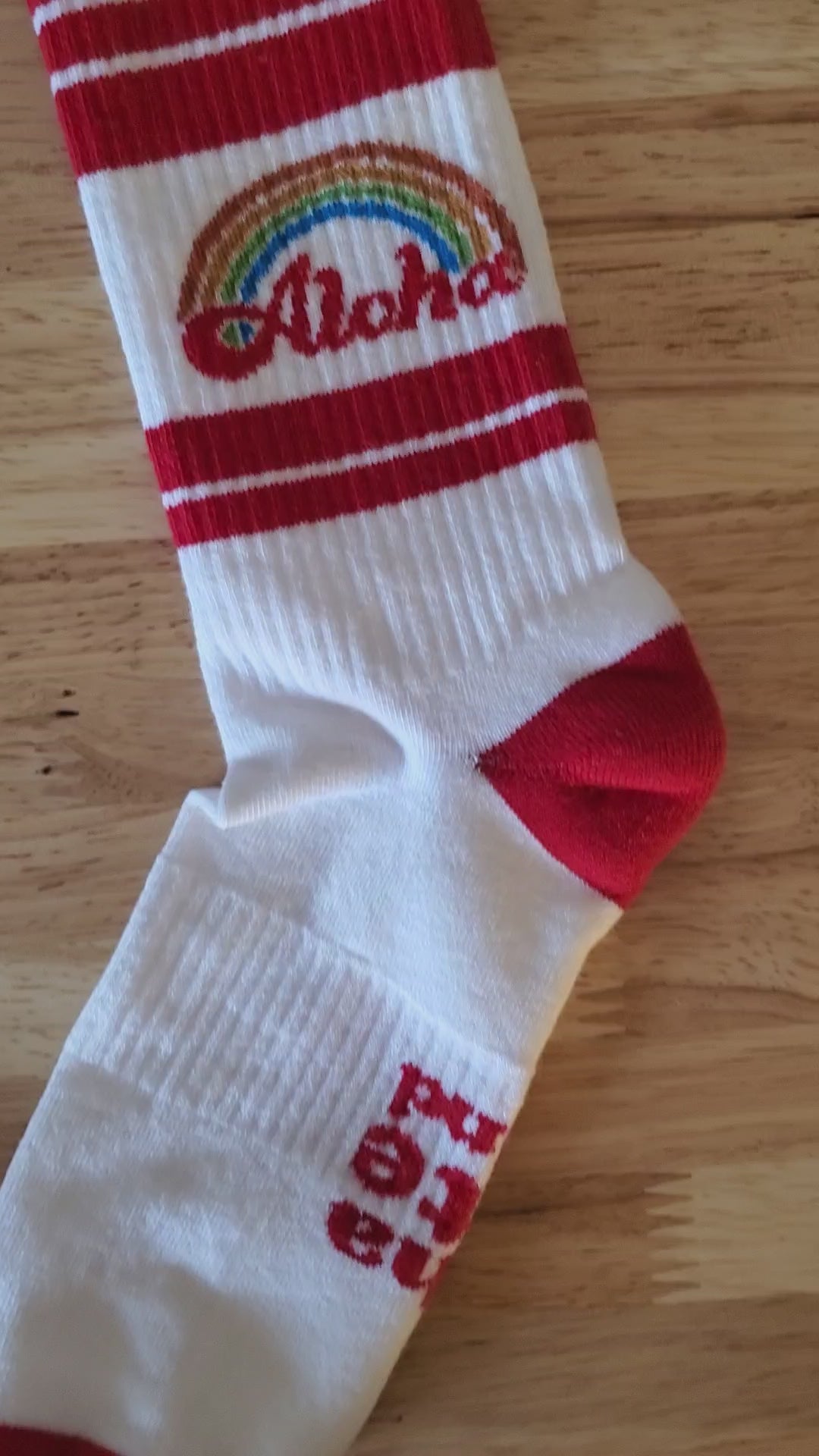 Get cozy with these adorable, 70s-inspired Aloha Rainbow socks. These sporty and unique crew socks feature an Aloha Rainbow on one side and a cute red heart on the other. Who doesn't love a little matchy mismatch?