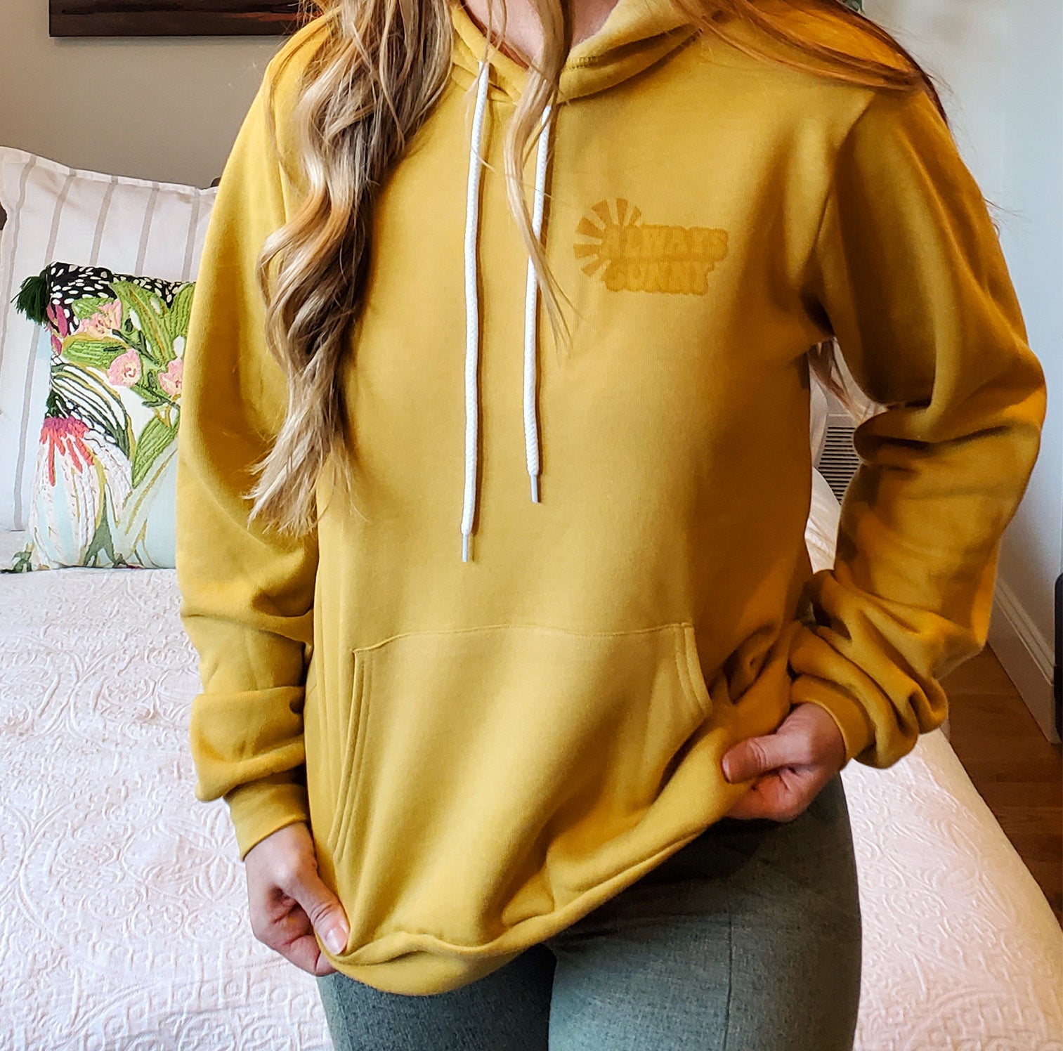 The Always Sunny Hoodie is created with love in my home studio with high-quality materials. It is printed using sublimation, where the ink is infused directly into the fabric. Pretty cool huh?