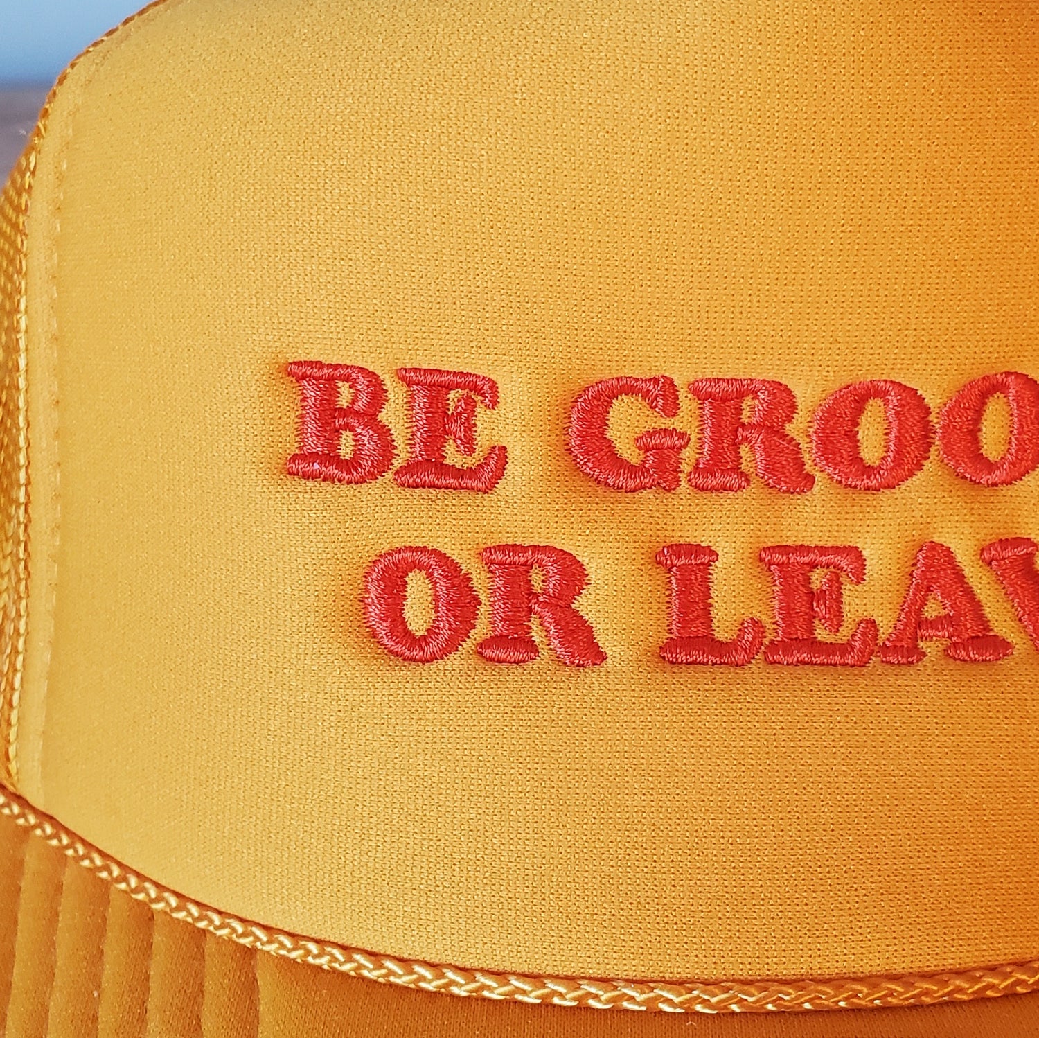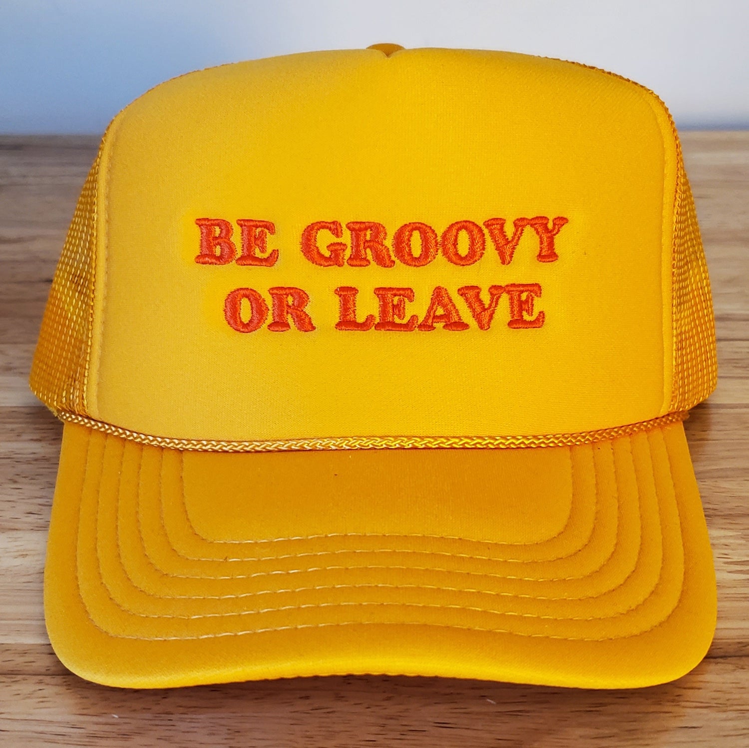 Keep the good vibes flowing with our Be Groovy or Leave Trucker Hat. Retro-inspired, dark orange typography is embroidered on a golden yellow five-panel foam trucker hat. This hat will make the perfect companion for a day in the sun, on the trail or trip into town.