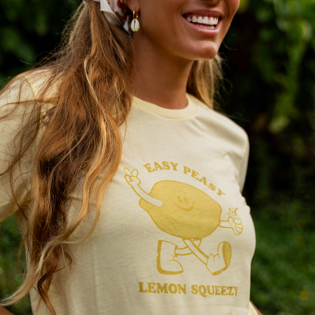 We all have those funky expressions that make their way into our everyday conversations. Easy Peasy Lemon Squeezy is exactly that, and offers a healthy dose of positivity. Paired with a cute illustration, you'll love this super soft tee. Model is wearing a medium.