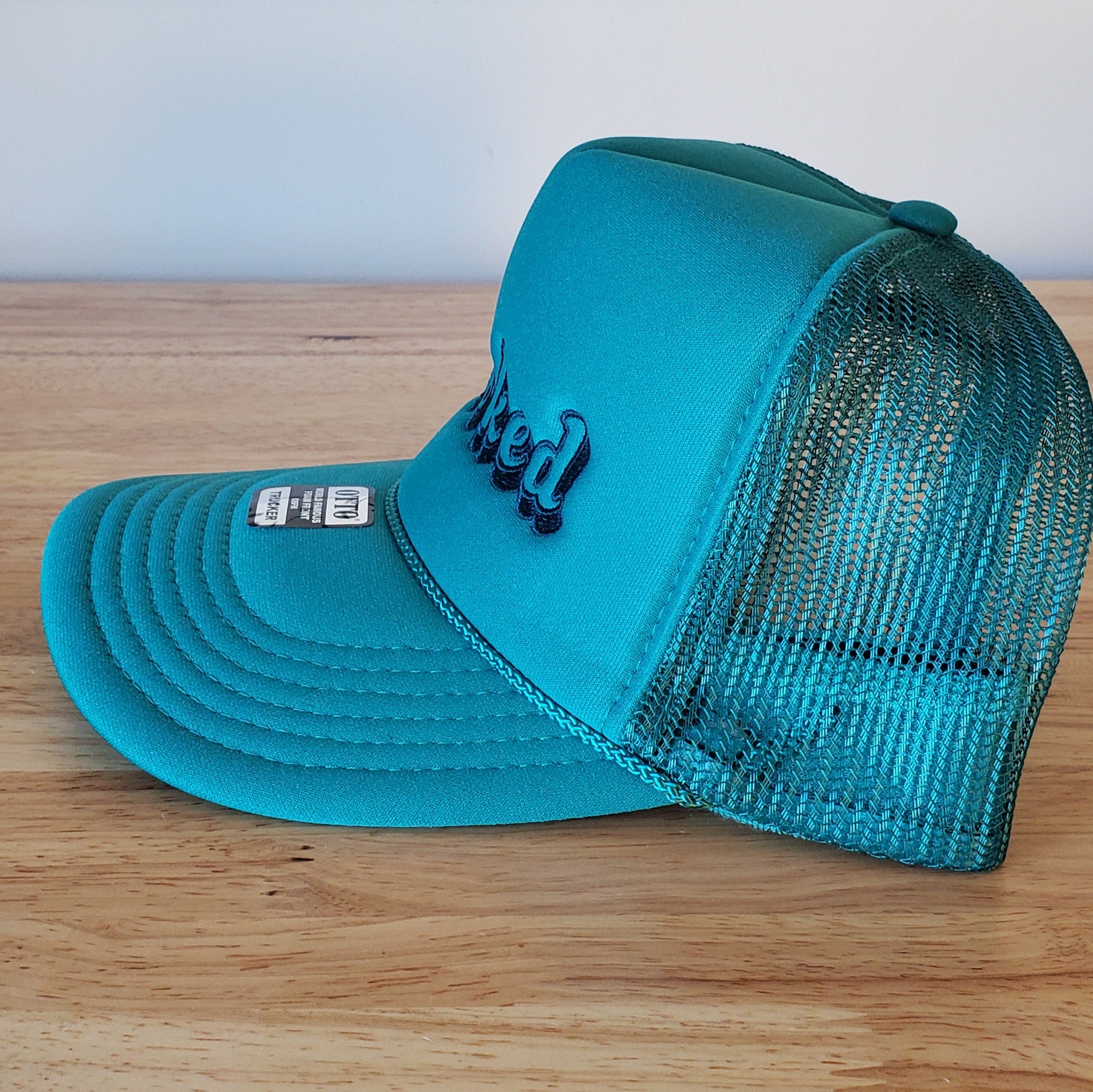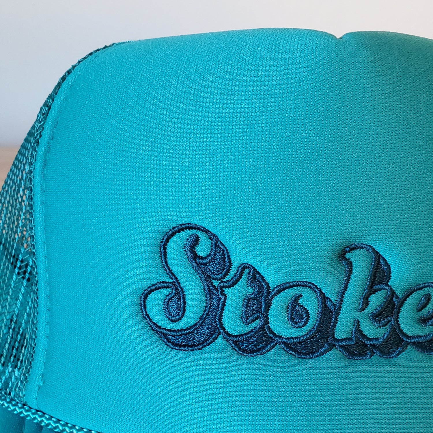 Get stoked. This trucker hat is retro-inspired and features dark teal typography, embroidered on a jade color, five-panel foam trucker hat. This hat will make the perfect companion for a day in the sun, on the trail or trip into town.