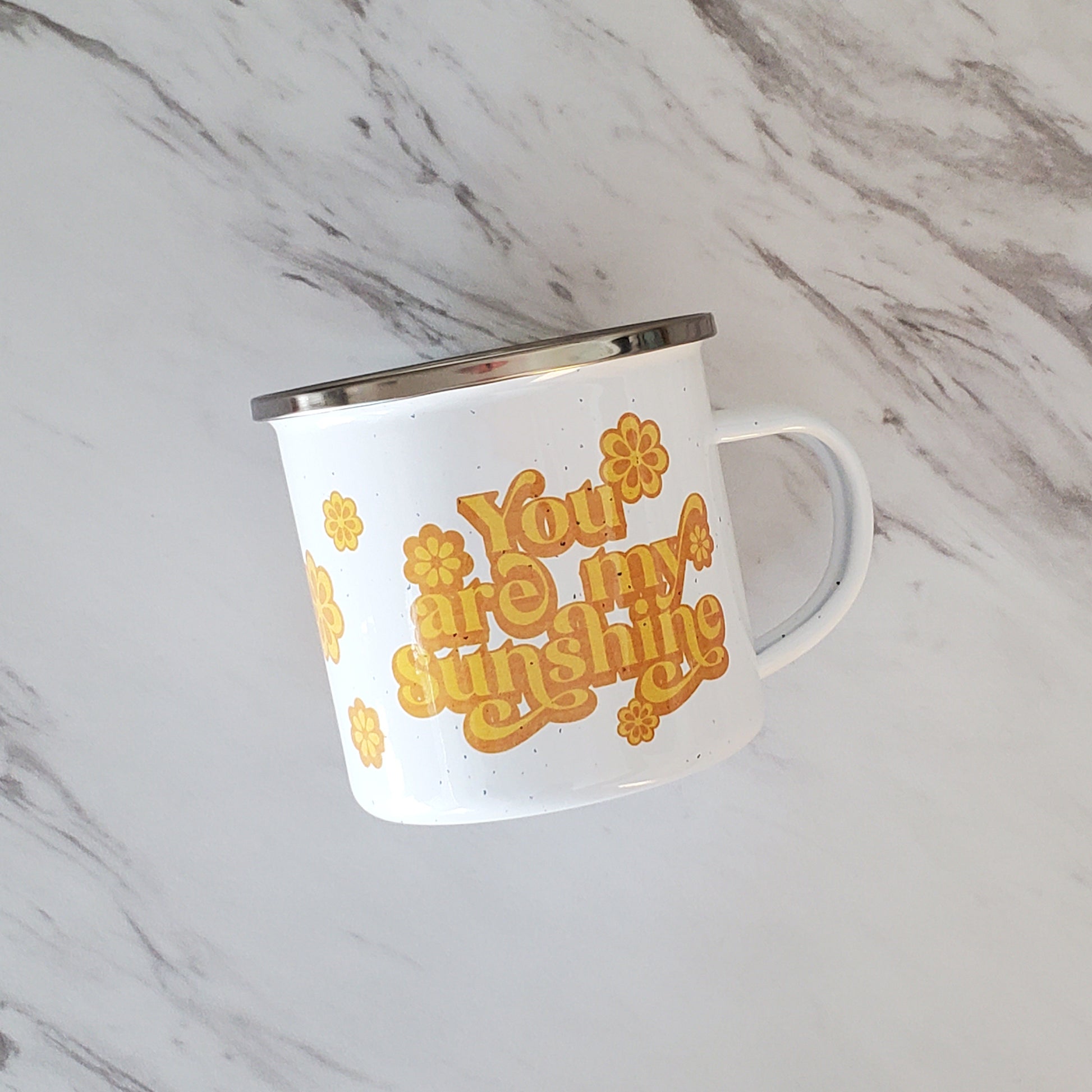 Get groovy with this retro vibin' 12oz Camping Mug. Lightweight, durable, multifunctional and oh so cute! Choose between "speckled" white enamel or white enamel. Design is on both sides of the mug.